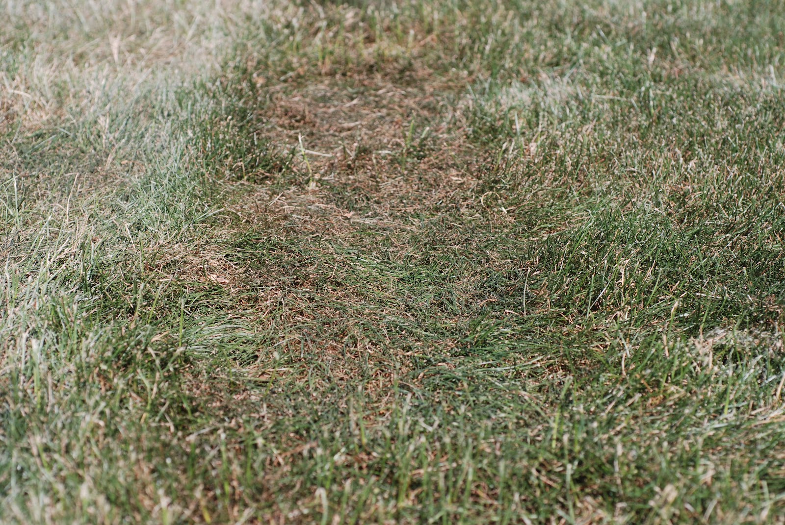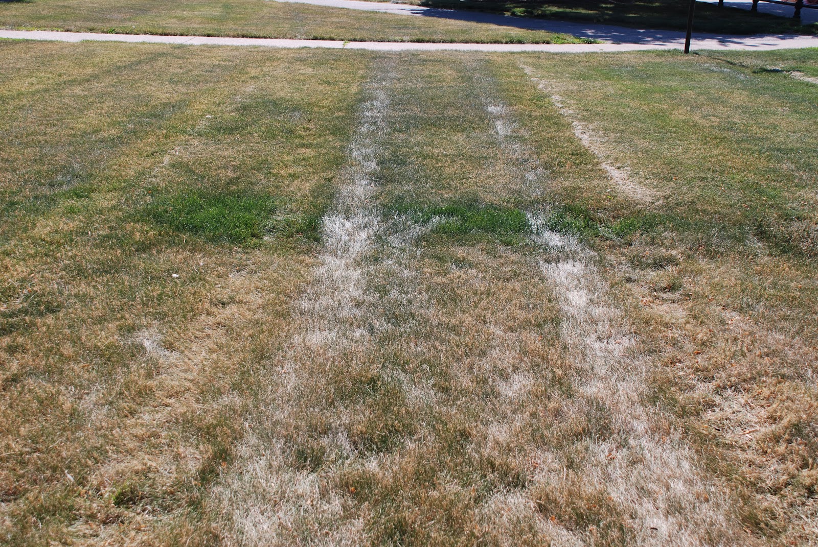 Notice how the turf is laid down here after the tires from the mower ran across it and the turf has not “bounced-back” due to moisture stress and a lack of water.
